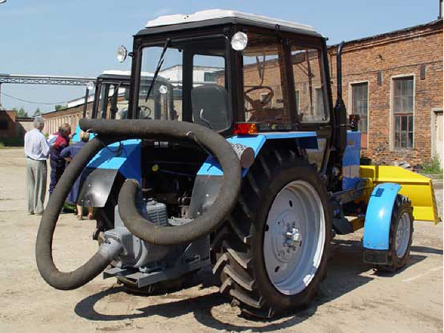 Установка для откачки воды УВ-2 - состоит из базового трактора Беларус 82.1 с установленным на нем бульдозерным оборудованием спереди и оборудованием для откачки воды сзади.