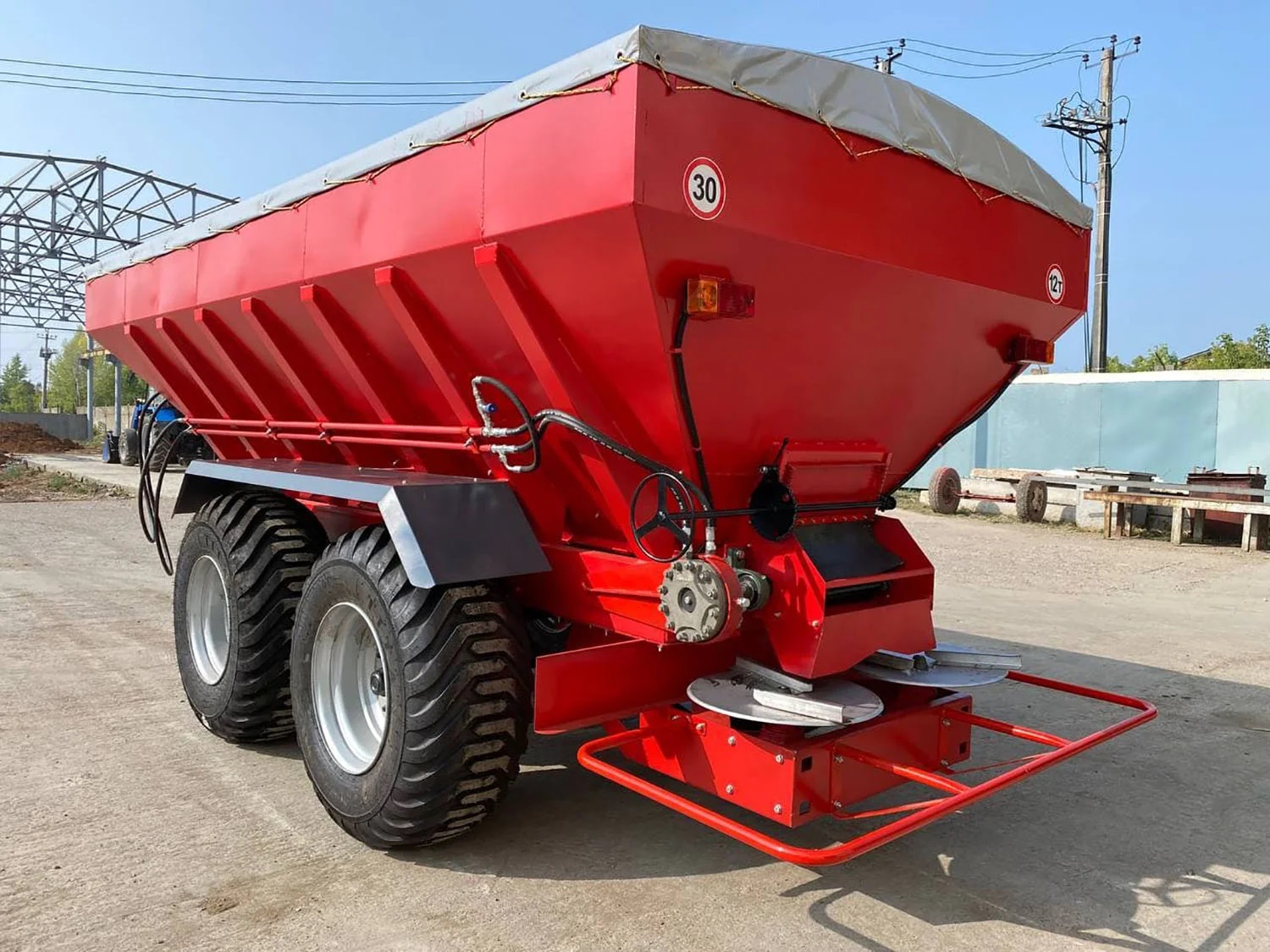 Тент позволяет работать в дождь или при сильном ветре, сохраняя целостность и качество удобрений.
